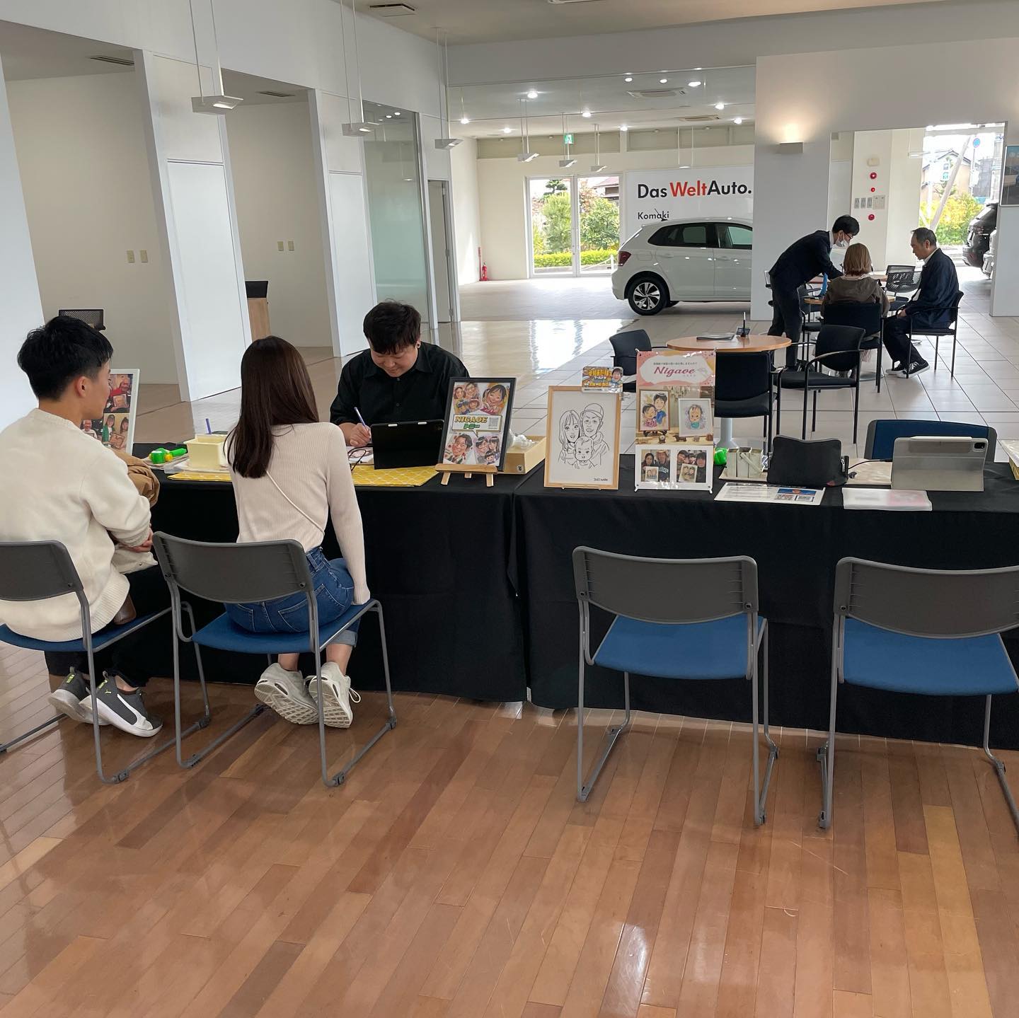 フォルクスワーゲン小牧店様からのご依頼でお客様向けのイベントに作家2名体制で出張しました。ご予約されたお客様を中心に空き時間にはスタッフの方の似顔絵も作画。お客様の反応も良く店舗の担当者様にも大変喜んで頂けました◎