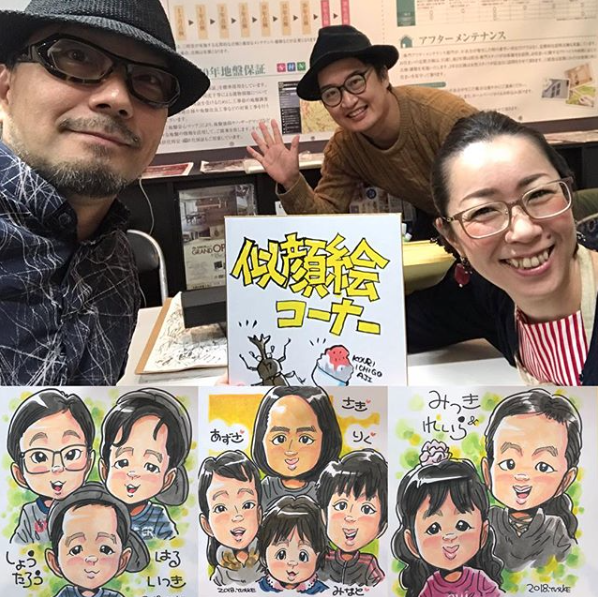 一宮のハウスメーカー『三昭堂』様で開催されたお客様感謝祭へイベント出張しました。クジで当選された方を対象に似顔絵を描かせて頂きました。恒例のイベントでリピーターの方も多かったです。似顔絵を描かせて頂いたかたには大変喜んでいただけました。ありがとうございました!